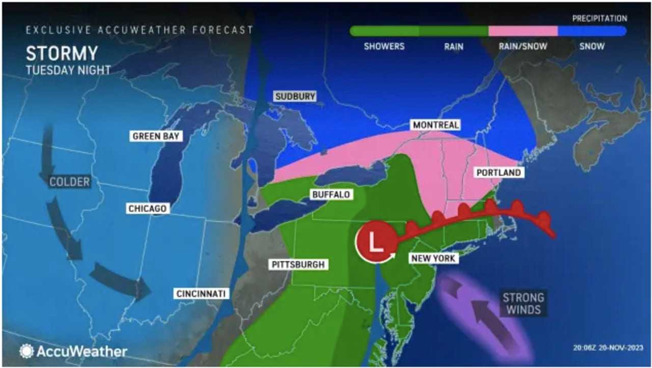 "This could lead to a few downed trees or power lines," the National Weather Statement said in a statement issued early Tuesday morning. Locations in upstate New York and northern New England will see a period of snow or sleet before precipitation changes to plain rain Tuesday night. Some northern and high terrain areas will see a few inches of accumulation and a Winter Weather Advisory is in effect for these areas, where travel may be impacted by the wintry precipitation.