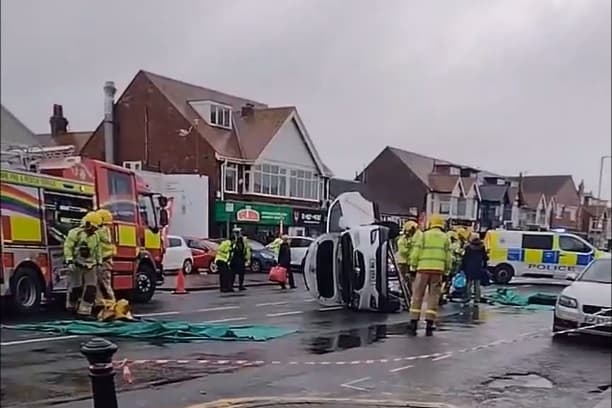 Visit Shots! now[1]An man in his 70s was rescued from an overturned car after a crash in Cleveleys town centre on Thursday (December 4). Police, ambulance and fire crews attended the scene outside The Jolly Tars Wetherspoons pub in Victoria Road West at around 1pm. The road was cordoned off while the emergency services worked at the scene and fire crews pulled the driver, aged in his late 70s, out of the overturned Vauxhall Mokka.
