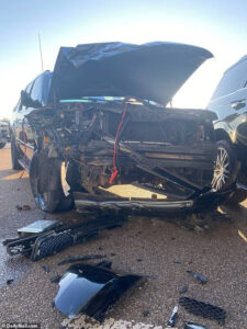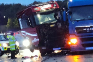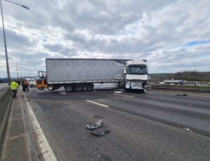 Car crashes into lorry and sends wheel into bar window