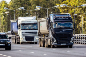 Lorry driver cruises truck down motorway with hands off wheel to roll cigarette